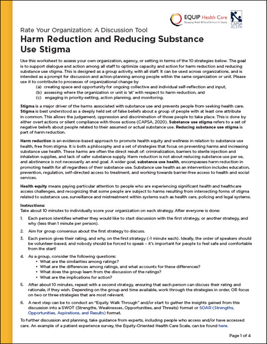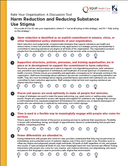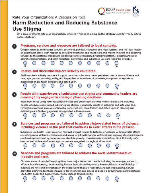 EQUIP Health Care, Community Addictions Peer Support Association. (2022). Rate Your Organization: Harm Reduction and Reducing Substance Use Stigma. A Discussion Tool. Vancouver, BC. www.equiphealthcare.ca