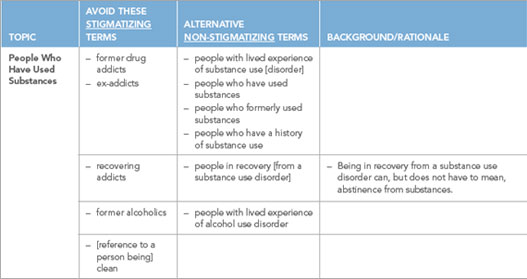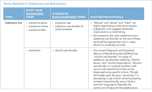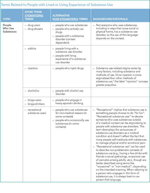 Canadian Centre on Substance Use and Addiction. (2019). Overcoming stigma through language: A primer. https://www.ccsa.ca/sites/default/files/2019-09/CCSA-Language-and-Stigma-in-Substance-Use-Addiction-Guide-2019-en.pdf